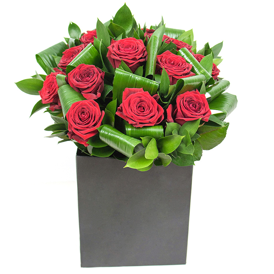 Enhance your living space with our Sophisticated Red Roses Arrangement, combining the vibrant charm of red roses with the lushness of aspidistra leaves and the delicate ruscus. This unique bouquet brings style and elegance to any setting.